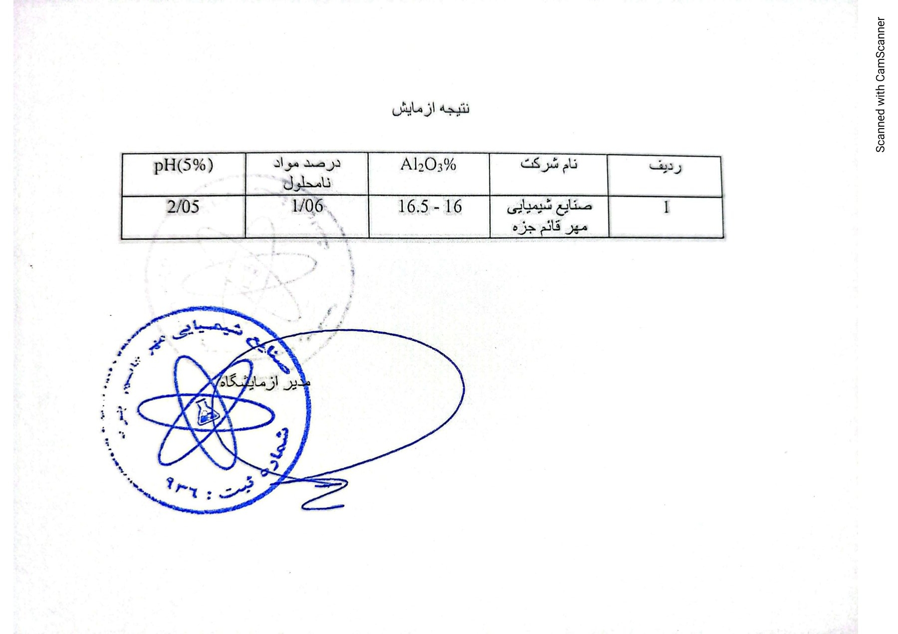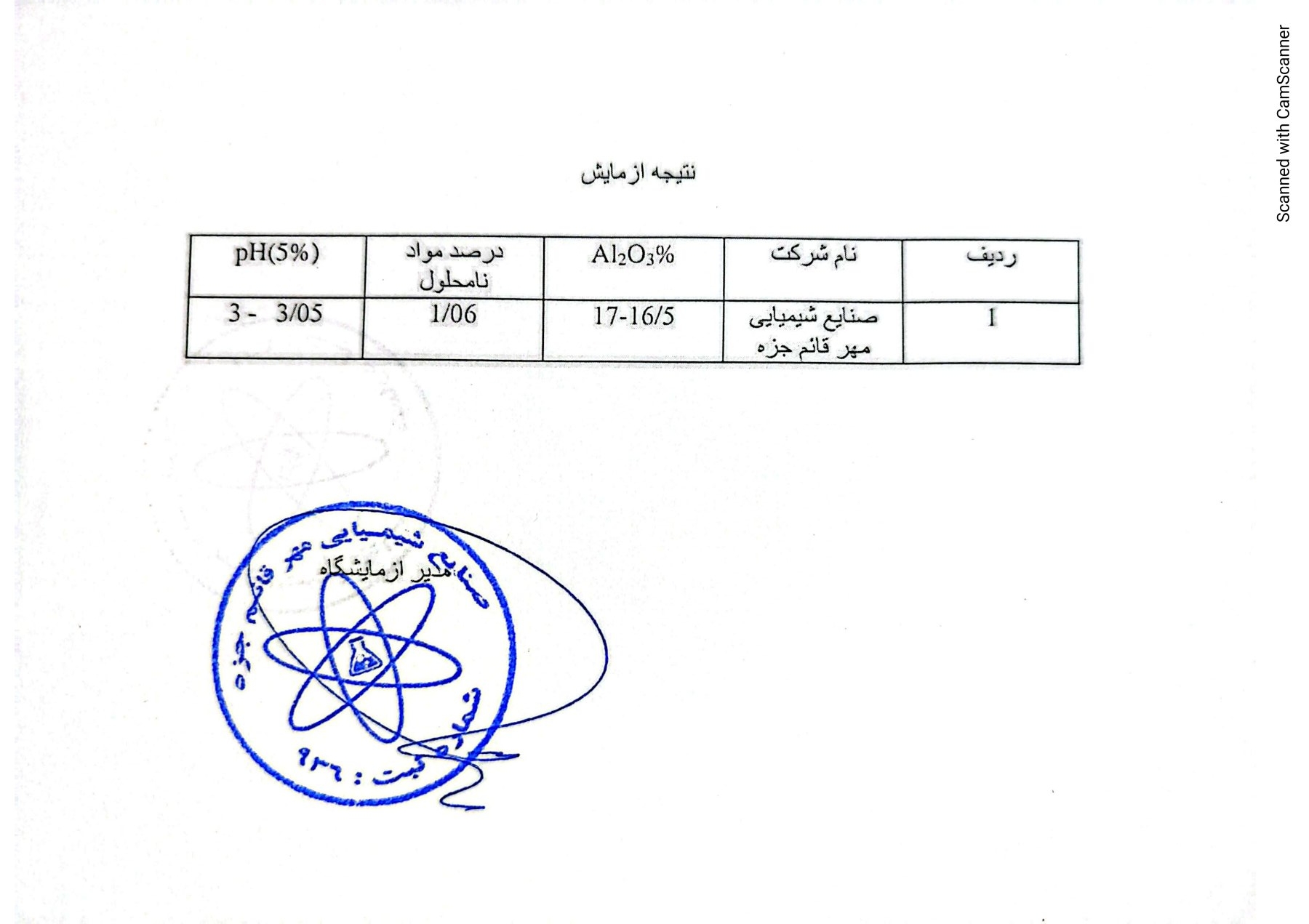 این شرکت در دو گرید مختلف امکان تولید سولفات الومینیوم را دارد نمونه انالیز و ازمایش شده محصول در اسلاید زیر موجود میباشد.